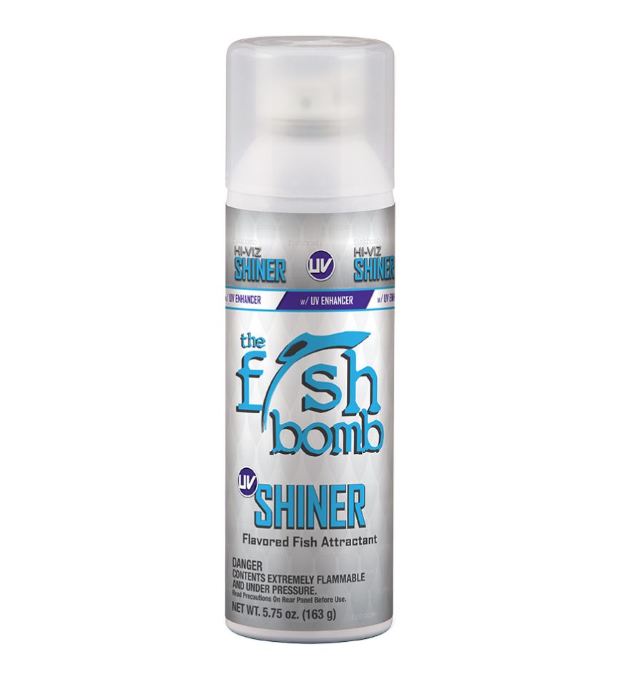 Shiner Flavored Fish Bomb with Hi-Viz UV Additive is a Fish Oil Based aerosol attractant that not only fish can smell and taste, but can also see. This product can be sprayed directly in baits bags, on lures, or locked down and used to create the ultimate chum slick. Simply spray down your lure or bait to provide the ultimate bite and hold reaction -