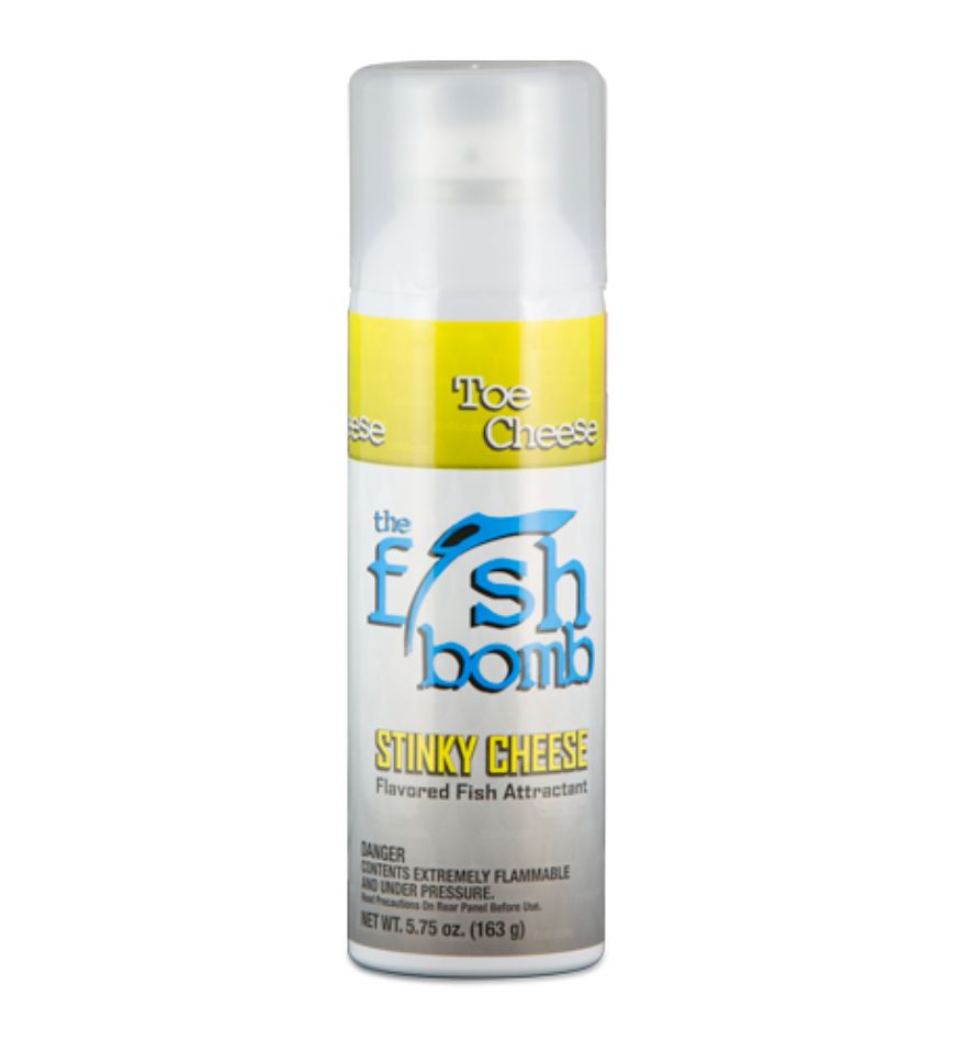 Stinky Cheese Flavored Fish Bomb (nicknamed - Toe Cheese) is a Fish Oil and Stinky Cheese flavored aerosol attractant. It can be sprayed directly on baits/lures, or locked down and used to create the ultimate chum slick. Simply spray down your lure or bait to provide the ultimate bite and hold reaction - Clip a Fish Bomb to a down line, lock down the tab and submerge it to the depth of where the fish are for the ultimate chum slick - designed for Fresh or Salt Water.