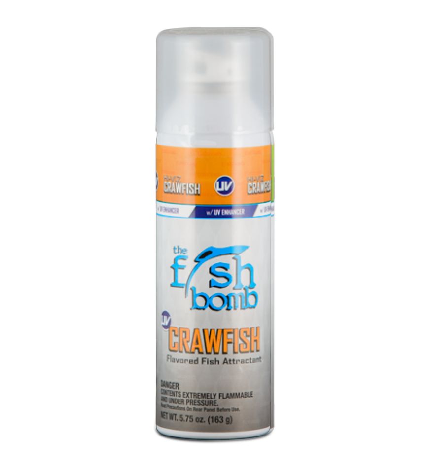 Crawfish Flavored Fish Bomb with Hi-Viz UV Additive is a Fish Oil and Crawfish Flavored aerosol attractant that not only fish can smell and taste, but can also see. This product can be sprayed directly on baits/lures, or locked down and used to create the ultimate chum slick. Simply spray down your lure or bait to provide the ultimate bite and hold reaction - Clip a Fish Bomb to a down line, lock down the tab and submerge it to the depth of where the fish are for the ultimate chum slick – High Visible Ultra Violet enhanced additives stimulate the fish’s vision allowing fish to see the attractant - Use with Tightlines-UV lures and baits for the ultimate combination - designed for Fresh or Salt Water.
