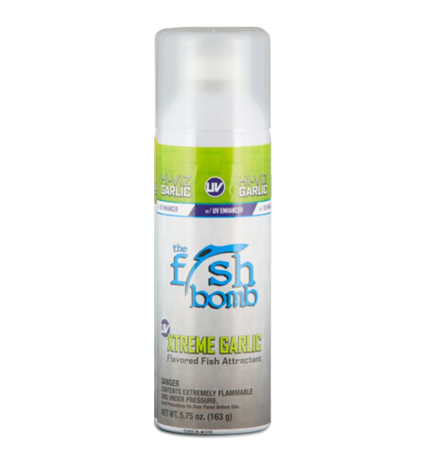 Garlic Flavored Fish Bomb with Hi-Viz UV Additive is a Fish Oil and Garlic Flavored aerosol attractant that not only fish can smell and taste, but can also see. This product can be sprayed directly on baits/lures, or locked down and used to create the ultimate chum slick. Simply spray down your lure or bait to provide the ultimate bite and hold reaction - Clip a Fish Bomb to a down line, lock down the tab and submerge it to the depth of where the fish are for the ultimate chum slick – High Visible Ultra Violet enhanced additives stimulate the fish’s vision allowing fish to see the attractant - Use with Tightlines-UV lures and baits for the ultimate combination - designed for Fresh or Salt Water